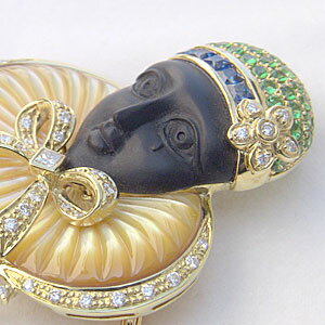 商品明細■イエローシェル 襟元 ■オニキス ピエロの顔地金■k18 ゴールド石■ダイヤモンド ■形:ラウンド/プリンセス ■個数:54石 ■0.98ct■グリーンガーネ ■形:ラウンド ■個数:38石 ■1.18ct■ファンシーサファイア ■形:ラウンド/角 ■個数:18石 ■2.40ctサイズ■縦 約40.32mm×横 約65.90mm備考※自然光の下で撮影しております。