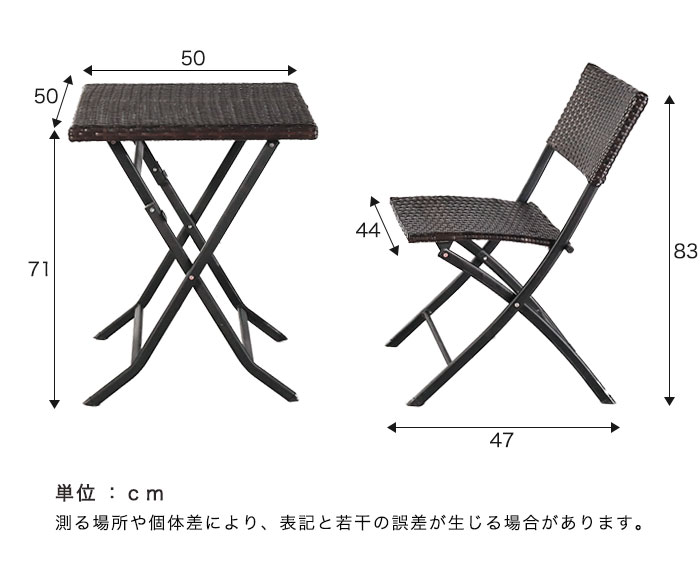 商品詳細 サイズ ■テーブル 幅:50cm×奥行:50cm×高さ:71cm ■チェアー 幅:44cm×奥行:47cm×高さ:83cm ■梱包サイズ 1:幅95cm×奥行62cm×高さ32cm 2:幅95cm×奥行62cm×高さ32cm 仕様 PEラタン、スチール ※パイプ商品の為、輸送中に脚部が歪み、設置時に天板が斜めになる場合が稀にあります。