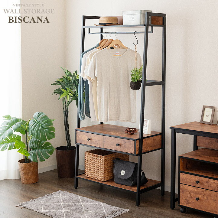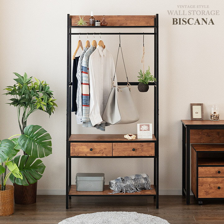 ハンガーラック 引き出し付 おしゃれ 棚付き アイアン シェルフ ラック 棚 シェルフ ラック 棚 木製 ハンガーラック スリム 省スペース 幅80 北欧 アジアンインテリア リゾートインテリア ドウシシャ 壁面収納家具 ビスカーナ bc8017h-hr