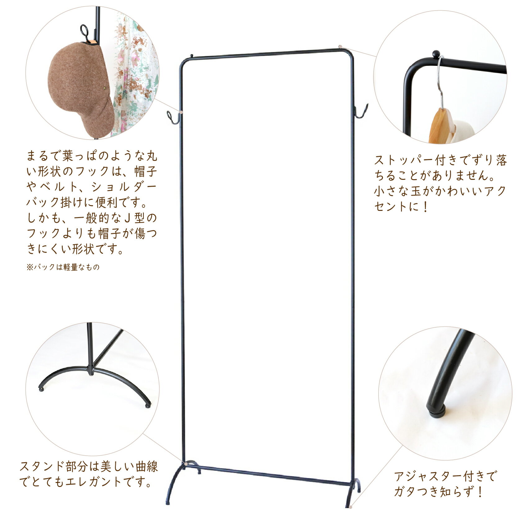組み立て式を活かした子供から大人までずっと使えるおしゃれなアイアンハンガーラック 商品説明サイズ 幅705×奥320×1600mm(子供用にした場合970mm) 材質 鉄 備考組立式(工具:六角レンチ同梱) 備考 クルクル回すだけの簡単組立!およそ5分程度で完成します。