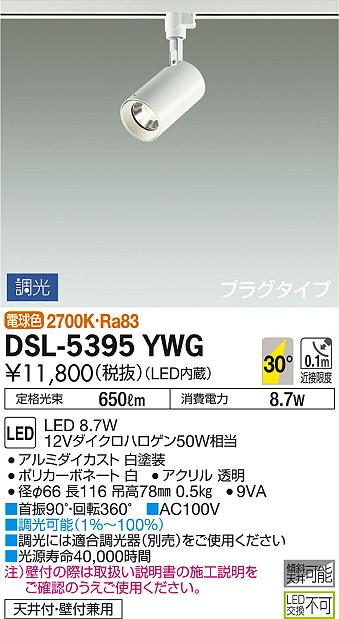 照明 おしゃれ かわいい 屋内大光電機 DAIKO 調光スポットライトDSL-5395YWG ダクトレール用白塗装 集光タイプ 30°天井付・壁付兼用 LED電球色 白熱灯100W相当 シンプル モダン